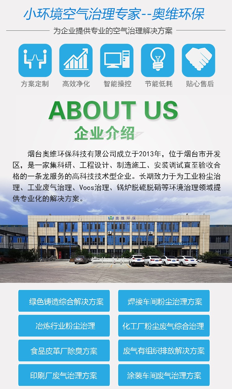 - 簡(jiǎn)介: 煙臺(tái)奧維環(huán)??萍加邢薰境闪⒂?013年,位于煙臺(tái)市開(kāi)發(fā)區(qū),是一家集科研、工程設(shè)計(jì)、制造施工、安裝調(diào)試直至驗(yàn)收合格的一條龍服務(wù)的高科技技術(shù)型企業(yè)。長(zhǎng)期致力于為工業(yè)粉塵治理、工業(yè)廢氣治理、Vocs治理、鍋爐脫硫脫硝等環(huán)境治理領(lǐng)域提供專業(yè)化的解決方案。