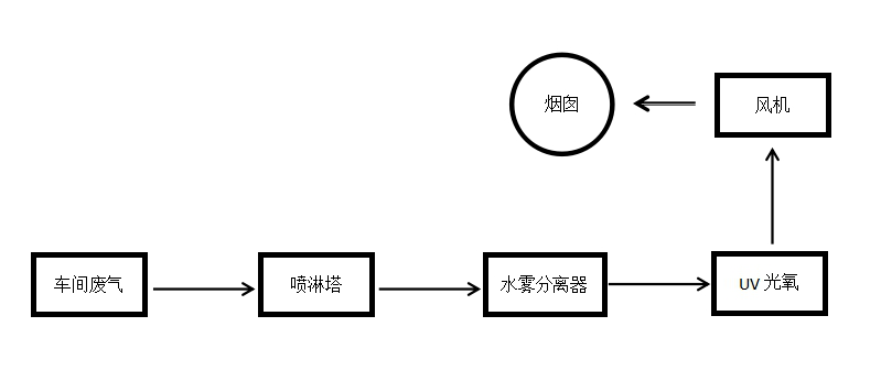工藝路線:采用噴淋塔+UV光氧工藝。廢氣進(jìn)入噴淋塔+UV光氧進(jìn)行吸附凈化,凈化達(dá)標(biāo)后直接排放;
