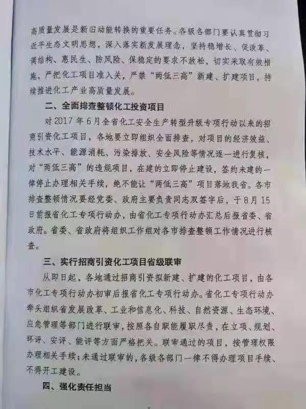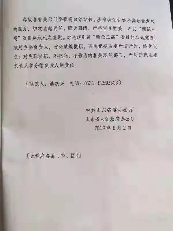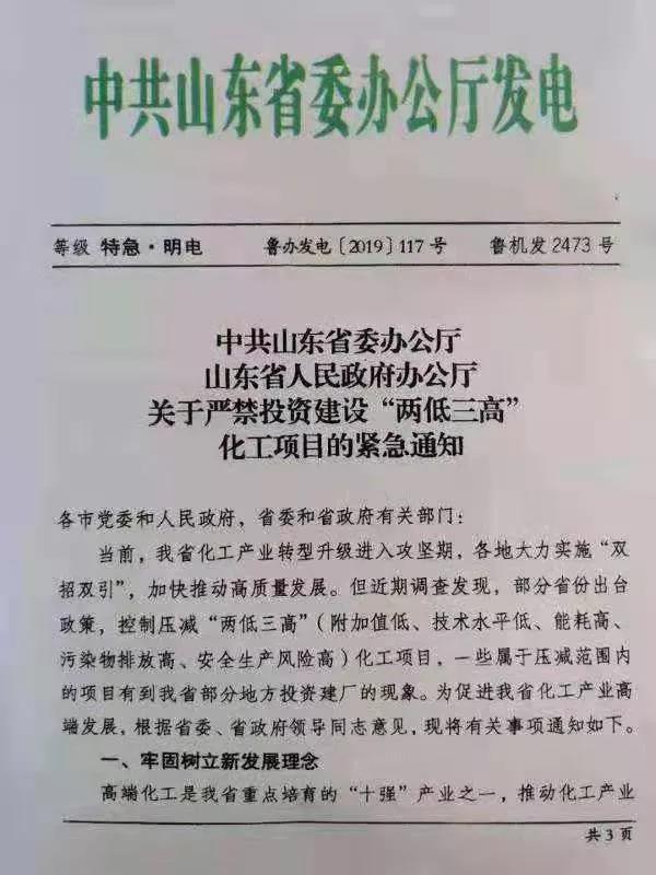 2019年8月2日,山東省政府發(fā)文,嚴禁引入“兩低三高”(附加值低、技術水平低、能耗高、污染物排放高、安全生產(chǎn)風險高)項目,將執(zhí)行招商引資化工項目省級聯(lián)審流程,全面排查整頓省內(nèi)的化工投資項目。