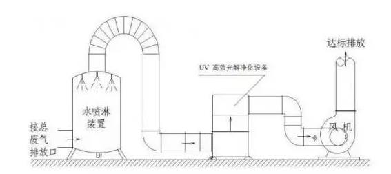 UV紫外法是利用特制的高能高臭氧UV紫外線光束照射廢氣,改變廢氣的分子結(jié)構(gòu),使有機(jī)或無機(jī)高分子廢氣化合物分子鏈在高能紫外線光束照射下,降解轉(zhuǎn)化成低分子化合物的方法。工藝流程圖如下: