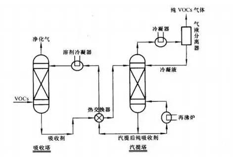 物理吸收是廢氣中一種或幾種組分溶解于選定的液體吸收劑中,這種吸收劑應(yīng)具有與吸收組分有較高的親和力,低揮發(fā)性,同時(shí)還應(yīng)具有較小的揮發(fā)性,吸收液飽和后經(jīng)加熱解吸再冷卻重新使用。常見工藝流程圖如下: