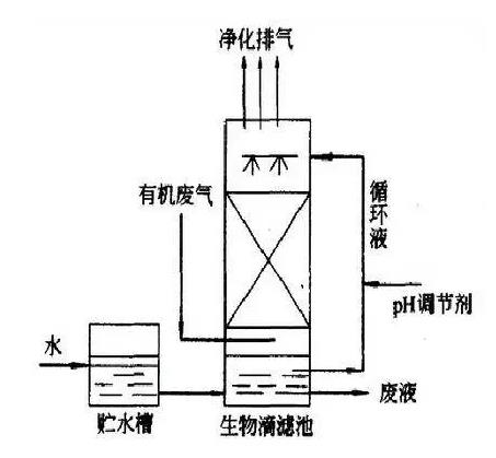 生物滴濾法是將廢氣經(jīng)過去塵增濕或降溫等預(yù)處理工藝后,從濾床底部由下向上穿過由濾料組成的濾床,廢氣由氣相轉(zhuǎn)移至水—微生物混和相,通過固著于濾料上的微生物代謝作用而被分解掉的一種方法。