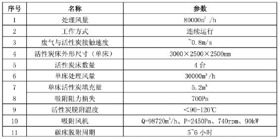 廢氣成分主要為苯系物(苯、二甲苯、甲苯等),活性炭床單床處理風(fēng)量為 30000m3/h,按照連續(xù)運(yùn)行方式設(shè)計(jì)則活性炭床數(shù)量為 4 臺(tái),工作時(shí)始終有一臺(tái)活性炭床處于備用狀態(tài)?;钚蕴看苍O(shè)計(jì)空塔氣速 0.8m/s,駐留時(shí)間為 0.625s,按初始濃度 200mg/m3計(jì)算則單床吸附周期為 93.7h。